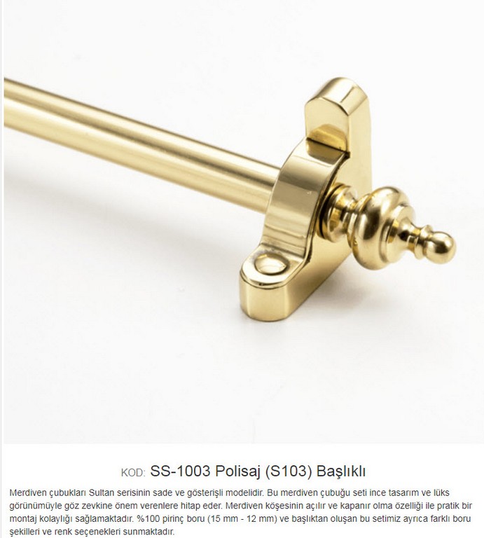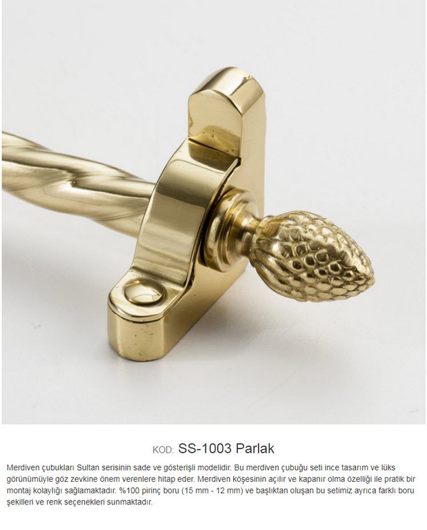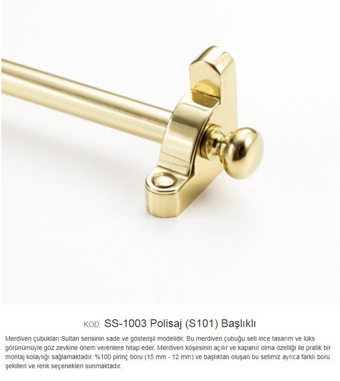 Ehil 1003 15-12 mm Sade ve gösterişli merdiven çubuğu. Açılır-kapanır modellerimiz içinde en pratik olanıdır. %100 pirinç boru ve başlıktan oluşan bu sistemimize isteğe bağlı olarak uç eklenebilir, farklı başlık ve boru seçenekleri mevcuttur. Çubuğu dekoratif yüksek kalite pirinç malzemeden Burgulu olarak üretilmiştir. Halı hav yüksekliğine göre çubuk kalınlığının seçilmesi çubuğun daha iyi tutuş yapmasını sağlamakta etkili olur.Halı dip çıtası ve halı dip demiri gibi isimler altında satılmakta olan halı merdiven çubuğunu alırken dikkat edilmesi gerekenler. Ürünün pirinç malzemeden üretilmiş olmasıdır.Demir çubuklar paslanmaya ve oksitlenmeye karşı dirençli değildir.İç ve dış kullanımlarda tutturduğunuz (Halı,Kıvırcık,Pvc Paspas ) gibi malzemeye kalıcı olarak zarar vermesi kaçınılmazdır. Kolay montaj ve montaj sonrası temizlik için kolay söküm yapılabilmektedir. Teknolojisi Halı çubuğu koleksiyonuna ait tüm modeller,son teknoloji ile donatılmış fabrikalarımızda üretilmektedir. Yapısı %100 pirinç malzemeden üretilmiştir. E-Satış Koşulları Ürünler belirlediğiniz başlıklarla birlikte takım olarak montaj elemanlarıyla gönderilmektedir. 1 mt ile 0,70 cm arası ölçüler 1 mt olarak hesaplanır.Kesilen çubuklar iade alınmaz. Ürünlerin sevk edilmesi talepleriniz doğrultusunda,ambar veya kargo ile yapılmaktadır.Ürün ödemesi alıcıya aittir Ürün teslimatı 2 ile 3 gün içerisinde yapılmaktadır. Açıklamalar Resim-fotoğraf renkleri ile gerçek ürün renkleri arasında farklılık olması kaçınılmazdır. Kullanım Alanları Konutlar-Oteller-Ofisler-Okullar-Yurtlar-Residenceler-Restaurantlar-Hastaneler-İşyerleri-Kreşler. Daha Kapsamlı bilgi almak için bize ulaşabilirsiniz. Teknik Özellikler