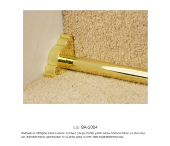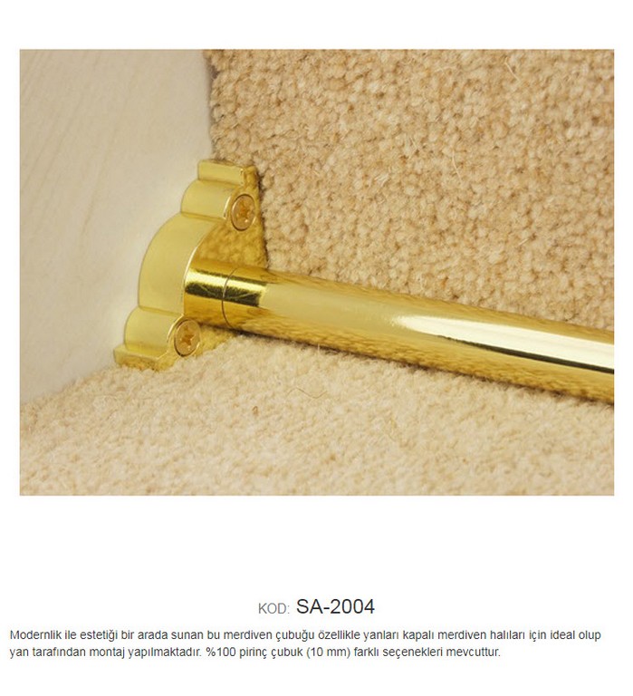 | Ehil 203-204 10 mm Sade ve gösterişli merdiven çubuğu. Açılır-kapanır modellerimiz içinde en pratik olanıdır. %100 pirinç boru ve başlıktan oluşan bu sistemimize isteğe bağlı olarak uç eklenebilir, farklı başlık ve boru seçenekleri mevcuttur. Çubuğu dekoratif yüksek kalite pirinç malzemeden Burgulu olarak üretilmiştir. Halı hav yüksekliğine göre çubuk kalınlığının seçilmesi çubuğun daha iyi tutuş yapmasını sağlamakta etkili olur.Halı dip çıtası ve halı dip demiri gibi isimler altında satılmakta olan halı merdiven çubuğunu alırken dikkat edilmesi gerekenler. Ürünün pirinç malzemeden üretilmiş olmasıdır.Demir çubuklar paslanmaya ve oksitlenmeye karşı dirençli değildir.İç ve dış kullanımlarda tutturduğunuz (Halı,Kıvırcık,Pvc Paspas ) gibi malzemeye kalıcı olarak zarar vermesi kaçınılmazdır. Kolay montaj ve montaj sonrası temizlik için kolay söküm yapılabilmektedir. Teknolojisi Halı çubuğu koleksiyonuna ait tüm modeller,son teknoloji ile donatılmış fabrikalarımızda üretilmektedir. Yapısı %100 pirinç malzemeden üretilmiştir. E-Satış Koşulları Ürünler belirlediğiniz başlıklarla birlikte takım olarak montaj elemanlarıyla gönderilmektedir. 1 mt ile 0,70 cm arası ölçüler 1 mt olarak hesaplanır.Kesilen çubuklar iade alınmaz. Ürünlerin sevk edilmesi talepleriniz doğrultusunda,ambar veya kargo ile yapılmaktadır.Ürün ödemesi alıcıya aittir Ürün teslimatı 2 ile 3 gün içerisinde yapılmaktadır. Açıklamalar Resim-fotoğraf renkleri ile gerçek ürün renkleri arasında farklılık olması kaçınılmazdır. Kullanım Alanları Konutlar-Oteller-Ofisler-Okullar-Yurtlar-Residenceler-Restaurantlar-Hastaneler-İşyerleri-Kreşler. Daha Kapsamlı bilgi almak için bize ulaşabilirsiniz. Teknik Özellikler